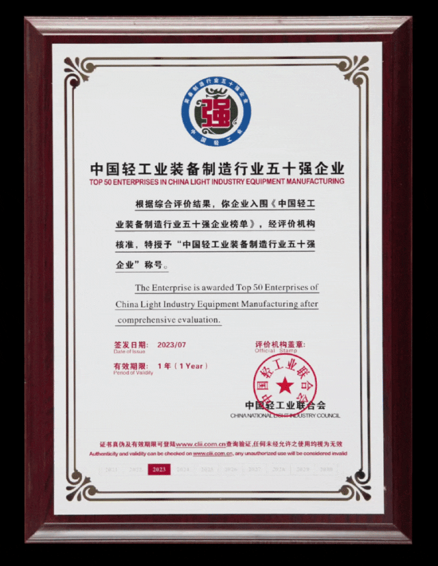 會上,中國輕工業(yè)聯(lián)合會發(fā)布了2022年度輕工裝備五十強企業(yè)評選結果,江蘇海獅機械名列第15位。