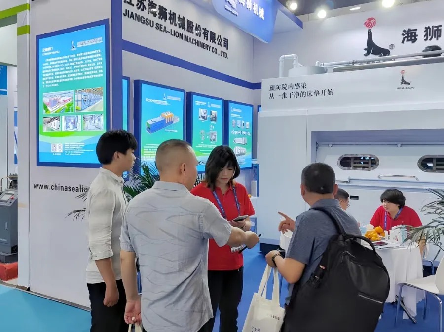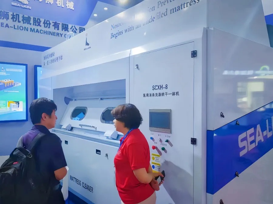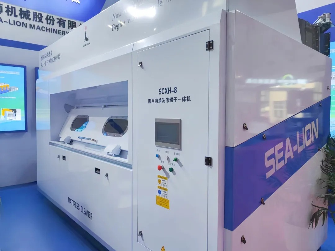 在本次展會上,海獅機械成為焦點。本公司擁有獨家知識產權的海獅醫用床墊一體機憑借獨特設計和卓越性能,贏得了參會者的高度贊譽。這款產品在醫用領域的獨特之處在于,它能夠解決醫院病房床墊難以批量清洗消殺的世紀難題,解決了醫用領域消殺全覆蓋的“痛點和盲點”,有效預防了醫院交叉感染風險。