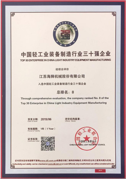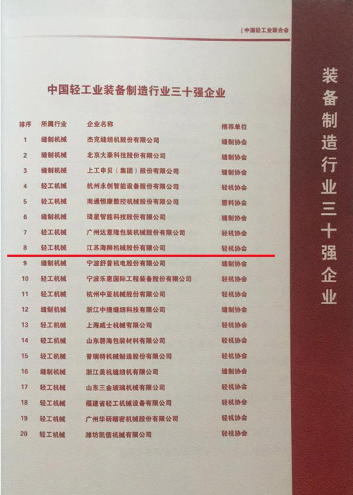 會議宣讀了中國輕工業百強企業評價公告,同時為中國輕工業百強企業頒發牌證,江蘇海獅機械股份有限公司作為洗滌行業領先企業,榮獲了“中國輕工業裝備制造行業三十強企業”、“中國輕工業科技百強企業”稱號,同時,在洗滌機械行業十強企業排在首位。