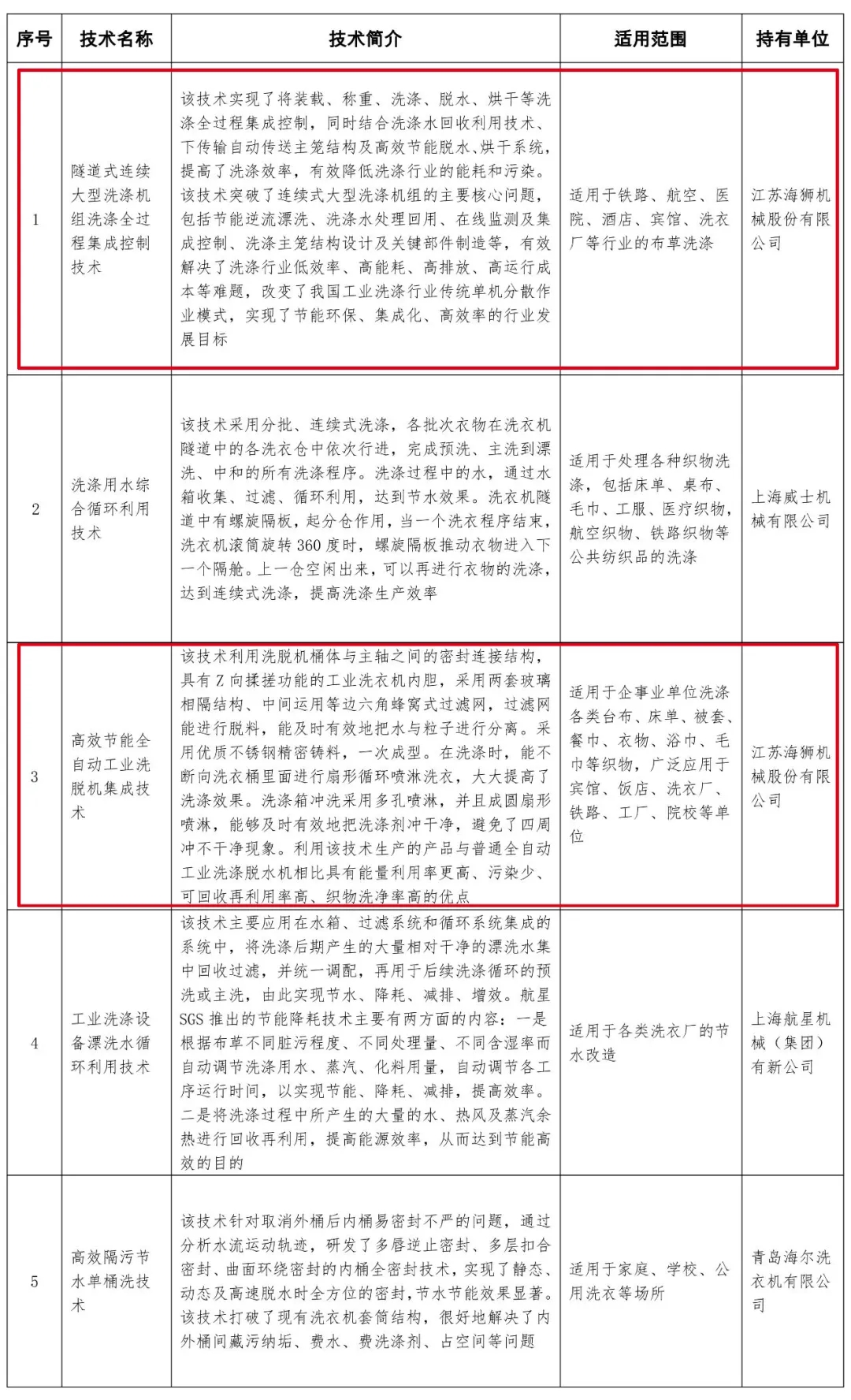 2020年11月16日,水利部、國(guó)家機(jī)關(guān)事務(wù)管理局關(guān)于公布國(guó)家成熟適用節(jié)水技術(shù)推廣目錄(2020年)的公告正式發(fā)布,為貫徹節(jié)水優(yōu)先方針,落實(shí)《國(guó)家節(jié)水行動(dòng)方案》目標(biāo)任務(wù),強(qiáng)化節(jié)水科技創(chuàng)新引領(lǐng),促進(jìn)水資源節(jié)約集約利用,水利部、國(guó)家機(jī)關(guān)事務(wù)管理局共同征集了洗滌設(shè)備、衛(wèi)生潔具、中央空調(diào)等領(lǐng)域的節(jié)水技術(shù)。經(jīng)專家評(píng)審、網(wǎng)絡(luò)公示,最后洗滌設(shè)備領(lǐng)域有4家企業(yè)5項(xiàng)成熟技術(shù)被收錄到《國(guó)家成熟適用節(jié)水技術(shù)推廣目錄(2020年)》中。江蘇海獅機(jī)械股份有限公司的隧道式連續(xù)大型洗滌機(jī)組洗滌全過程集成控制技術(shù)和高效節(jié)能全自動(dòng)工業(yè)洗脫機(jī)集成技術(shù)被收錄到國(guó)家成熟適用節(jié)水技術(shù)推廣目錄之中。